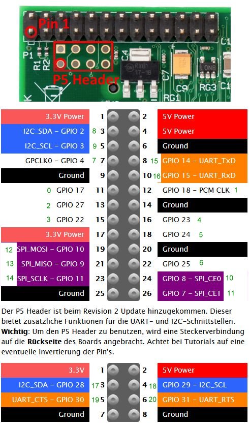 Pin-Belegung als Bild (Modell B, WiringPi in grün)